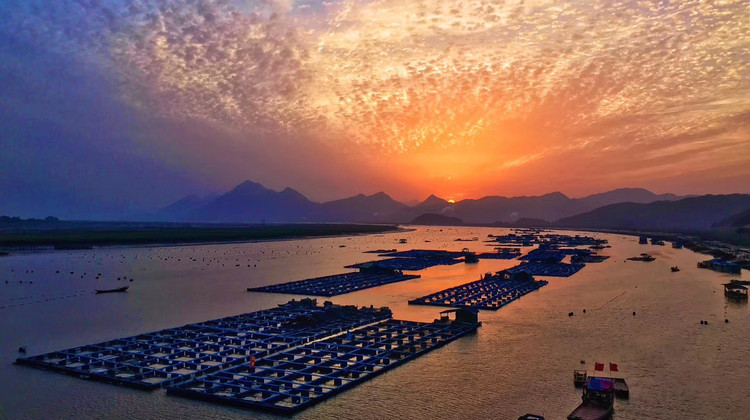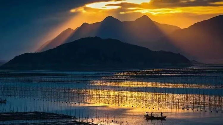霞浦滩涂风光旖旎,成为22大摄影地之一,每年前来拍摄滩涂风光的国内外影友多达20多万人次。每当北岐紫菜生产的繁忙季节,滩涂上万根竹竿插成一块块方形的网框,由远及近,绵延数十里,蔚为大观。清晨六点左右,一轮火球从海面上喷薄而出,瞬间,大海像镀上了一层金色霞衣,上百米的山道上,摄影师们屏住了呼吸,“咔嚓、咔嚓”声响成一片,紫菜在丝网上挂着一条条色带,红的,黑的,紫的,宛如一幅没有经过修饰的水墨画,被收入一个个镜头,被曝光在一张张彩色胶片上。