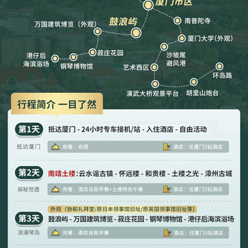 3、今日无行程,抵达后为自由活动,故无导游服务,接机/站送您至酒店办理入住,您可在酒店稍作休憩,或着您可以自行探索厦门哦~酒店办理入住时间正常为当天14:00,如果您提前抵达酒店,可将行李寄存在酒店前台,入住酒店若需支付押金,具体以前台收取为准,请妥善保管您的押金条以免造成不必要的损失。