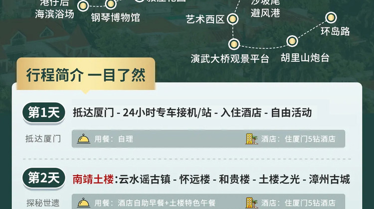 特别提示:【世遗土楼,共庆福年D1天为2月15/16/17出发班期,取消漳州古城行程,当天行程升级为土楼夜宴:非遗体验+篝火晚会+烟花等更多活动等您解锁】