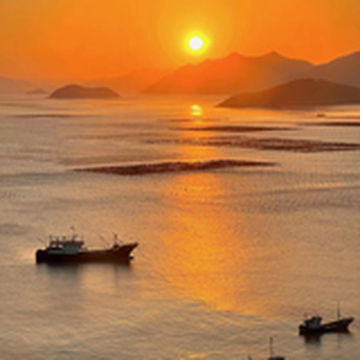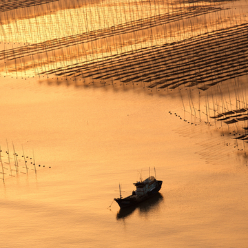 霞浦滩涂风光旖旎,成为22大摄影地之一,每年前来拍摄滩涂风光的国内外影友多达20多万人次。每当北岐紫菜生产的繁忙季节,滩涂上万根竹竿插成一块块方形的网框,由远及近,绵延数十里,蔚为大观。清晨六点左右,一轮火球从海面上喷薄而出,瞬间,大海像镀上了一层金色霞衣,上百米的山道上,摄影师们屏住了呼吸,“咔嚓、咔嚓”声响成一片,紫菜在丝网上挂着一条条色带,红的,黑的,紫的,宛如一幅没有经过修饰的水墨画,被收入一个个镜头,被曝光在一张张彩色胶片上。